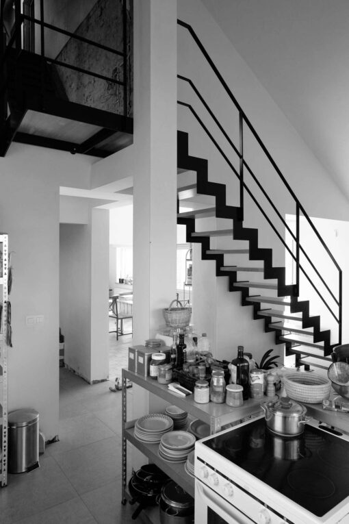 Met de openwerking en nieuwe positionering van de trap in de keuken wordt dan de verticale verbinding gemaakt met de rest van de woning.